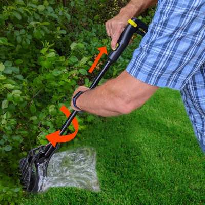 Engage lock release, rotate the handle, and position the target in front of the tool mouth. This works best when grass is short and dry.