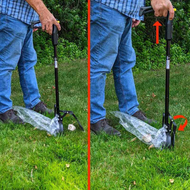 Tilt the Scooper forward and activate the sweeping claw with a squeeze of a hand lever to flick the target into your bag.